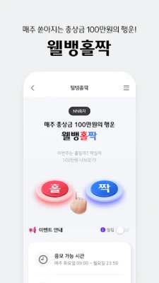 · 웰뱅홀짝: 홀일까? 짝일까? 맞추신 분들께 매주 총 상금 100만원을 나누어 드리는 혜택을 받아보세요.