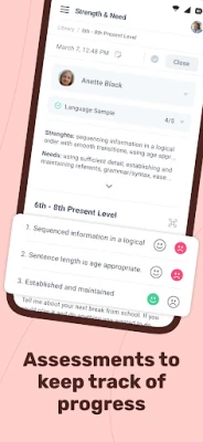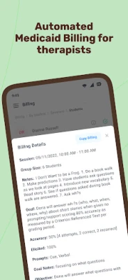 1. IEP Goal Tracking - collect data on IEP goals with a single click. 10+ data types to choose from 2. Graphs and Reports - beautiful reports and graphs automatically generated for your next IEP meeting 3. Collaboration - work alongside other clinicians & assistants, securely share & collect data in a team 4. Assessments - progress monitoring assessments ensure objective data on student skills is always available 5. Scheduling - set up your daily schedule 6. Medicaid Billing - automatically generate Medicaid billing notes 7. Materials & Community - a built-in materials library and a community of helpful professionals