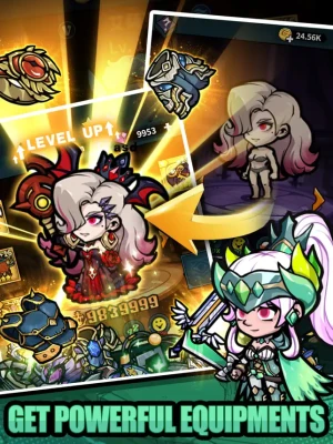 Craft epic and legendary weapons, accessories, and other gears in shops, boost them by various combinations with Gear Enhance Stones dropped in free idle battles, and equip them on your beloved heroes to fight far and wide!