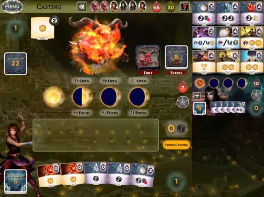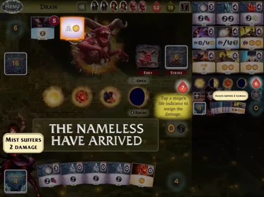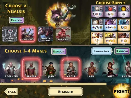 Each Mage has a unique starting card and an ability that can be charged to use in the fight. For example, Kadir has a gem that heals any mage, and an ability to let any mage prep a lot of spells. Xaxos has a spell that reveals the top card of the turn order deck and an ability that helps allies charge their abilities.