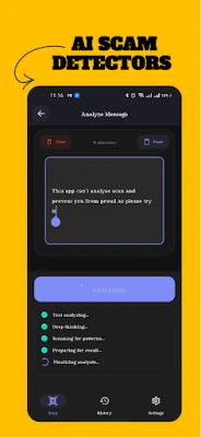 Have a message in a screenshot? Simply upload it, and the app extracts the text for complete scam analysis. No need to type anything manually!