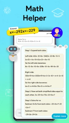 With AI Tutor and the math solver app, users can enter their queries in the provided field and receive real-time science answers with detailed explanations. To enhance convenience, the math app includes a set of preloaded questions that users can explore for qick reference. If a user wants to ask something new, they can simply type their question from scratch and get an instant response. This makes ai question answer app a valuable application for students, educators, writers, and anyone seeking reliable help with homewok on various topics.
