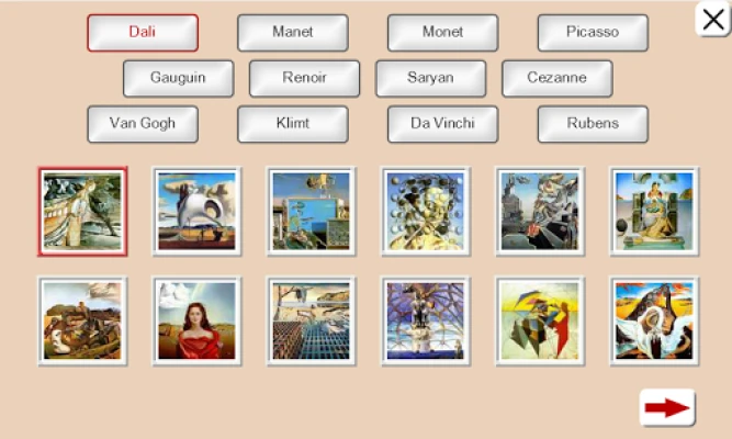 - 12 themes: "Dali", "Manet", "Monet", "Picasso", "Gauguin", "Renoir", "Saryan", "Cézanne", "Van Gogh", "Klimt", "Da Vinchi","Rubens";