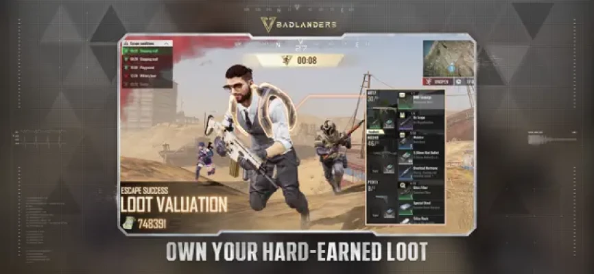 Badlanders lets you escape with your hard-earned loot and save them for later. You may upgrade/equip them for the next match or trade them for cash. Always aim for the next match, and keep your eyes on the prize!