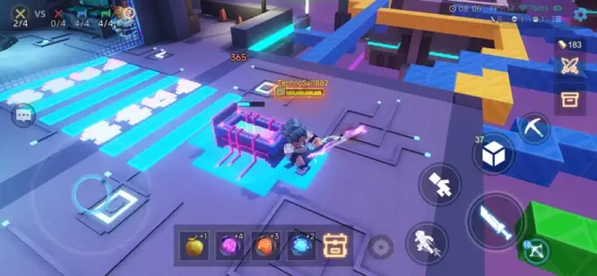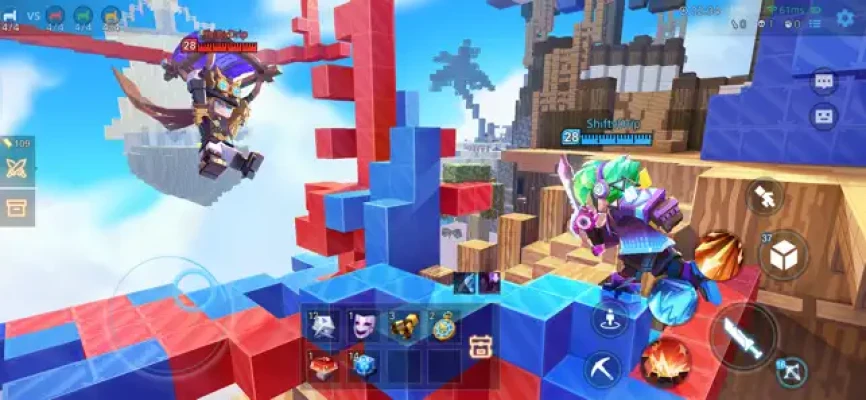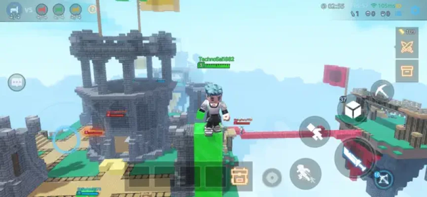 Team Work 16 players divided into 4 teams,spawning on different islands,build bridges with blocks to attack your opponents and contest the resources to upgrade your weapon and items so you can destroy your enemies' beds more easily! Get matched in seconds to compete with players from all over the world, the challenger spots are waiting for you!
