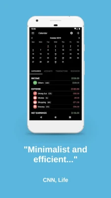 "minimalist and efficient, with seamless syncing of data across devices. It helps users keep track of credit cards, bank accounts, loans, and debts through graph reports, and allows for customizable budgeting categories that can be viewed per week, month, quarter, and year, among others."