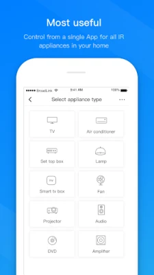 Now you can control from a single App for all IR appliances in your home: TV, air conditioner, set top box, media box, audio, amplifier, DVD/BD player, fan, lamp, water heater, air purifier, vacuum robot, humidifier....It perfectly supports all smartphones with IR port from Samsung, LG, Xiaomi, Huawei, HTC, etc.
