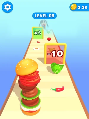 Swipe your hand left and right to grab tasty ingredients as you dash along the track. Pass through gates to grow your burger — but stay sharp! Obstacles are out to smash your stack to pieces.