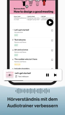 Entdecken Sie rund 60 Minuten Hörtraining pro Monat. Lernen, üben und hören Sie Business-Englisch, während Sie etwas anderes machen: im Auto, unterwegs, beim Kochen oder beim Sport. Hören Sie professionellen Sprecherinnen und Sprechern zu und verbessern Sie Ihren Wortschatz. Gleichzeitig trainieren Sie Ihre Aussprache.