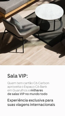 • 4 acessos gratuitos por ano (considerando os acessos às salas DragonPass, W Premium e Espaço C6 Bank), compartilhados entre titular, adicionais e acompanhantes