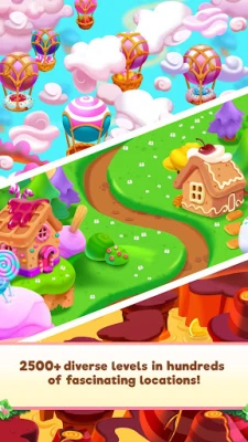 Meet with the Candyland inhabitants and travel together. Soda, Chocolate, Ice Cream, Jelly, and more cute friends are waiting for you. Match and swap your own sweet road through the Ice Cream Forest and Candy Valley! These are all home scapes for many desserts!
