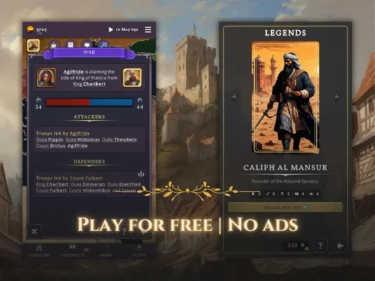 Enters Clovis, the ultimate grand strategy medieval war game on mobile, featuring unlimited medieval solo gameplay, no ads game, countless scenarios, and hours of offline fun. It's the perfect mix between offline war strategy and roleplaying narrative gameplay! The medieval game of your dreams!
