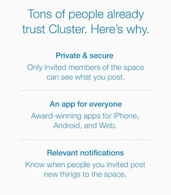 Cluster makes it possible to create private spaces where you share photos and memories with the people you care about. Create your own space with family, a group of friends, coworkers, people from your home town, or anyone else!
