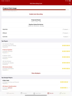 After the season is over, you’ll get to recruit the next class of players that will lead your team to bigger and better wins. You'll face off against teams across the country for the same players, and your program's prestige will affect how good the players available to you are. Stronger teams will be able to recruit higher-quality players, while weaker teams will need to allocate their effort strategically in order to build up their rosters.