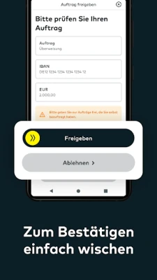 Sie führen eine Transaktion in einer anderen comdirect-App durch. Im Freigabe-Prozess für Ihre Transaktion öffnet sich automatisch die photoTAN App. Bestätigen Sie Ihren Auftrag, indem Sie den Pfeil von links nach rechts schieben.