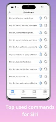 Unlock the power of Siri app with categorized Voice commands! Get all the features you love on you Siri: basic, reminders, calendar, HomePod, notes, music, calls, texts, iPhone control, funny Siri commands, translations, apple tv control, and more! Experience the ultimate siri assistant, optimized for Android. Download Siri Voice Assistant commands and say goodbye to limitations! We provide built-in necessary commands for Siri.