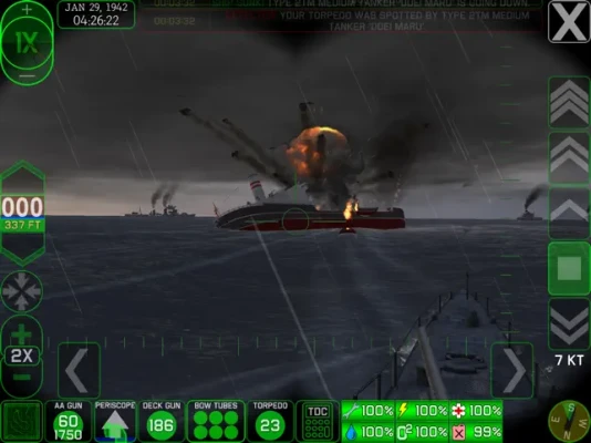 Sneak past the destroyers and torpedo the transports, or surface and engage the sub-chasers in a duel with your deck gun.