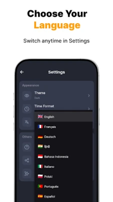 Switch the app language anytime in Settings.