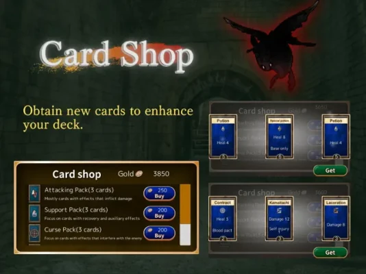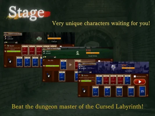 You have lost in the cursed area.There's no sunrises, darkened plain, black forest, and the labyrinth where you cannot see the end.Master using the spelled cards, and awake to be the unbeatable sorcerer.Defeat the dungeon master in the cursed labyrinth to break the spell.