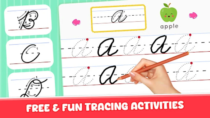 Our abc alphabet tracing and handwriting app helps to make the precise movements necessary for forming letters and improve hand/eye coordination. Increases brain activation and improves performance across all academic subjects. Have fun while tracing letters & learning cursive handwriting!