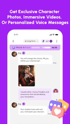 Create & Customize: Design your own virtual character, complete with a one-of-a-kind personality and avatar, And add dynamic events or plots exclusive to you and the characters to take your relationship with the characters to a higher level.