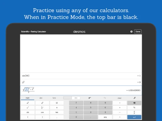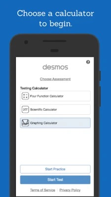 ** These are restricted versions of the Desmos Calculators that comply with exam requirements. To prepare for specific state or national assessments, select the corresponding test from the menu in the app. Find out whether Desmos is used for your test at www.desmos.com/testing.