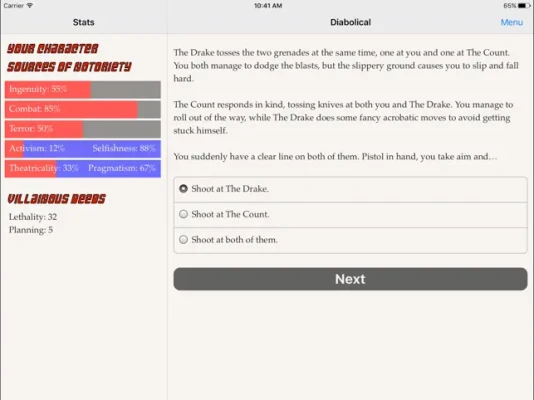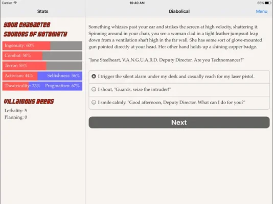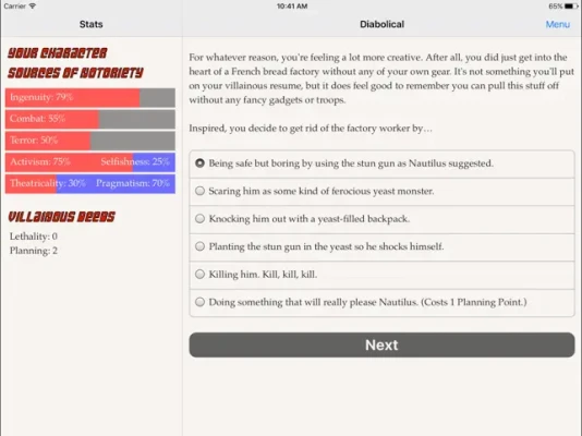 "Diabolical" is a 130,000-word interactive novel by Nick Aires, where your choices control the story. It's entirely text-based--without graphics or sound effects--and fueled by the vast, unstoppable power of your imagination.