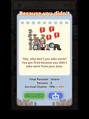 ‘Don’t get fired!’, is a survival game where you get to play a character who has no money, no connections whatsoever. You need to make him climb up the company ladder from an ‘intern’ to the ‘president’.