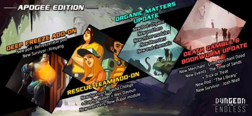 Dungeon of the Endless: Apogee is the award-winning Rogue-Like Dungeon-Defense game, in which you and your team of heroes must protect the generator of your crashed ship while exploring an ever-expanding dungeon, all while facing waves of monsters and special events as you try to find your way out. The Apogee Edition of Dungeon Of The Endless includes the full game and five DLCs.