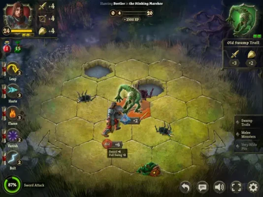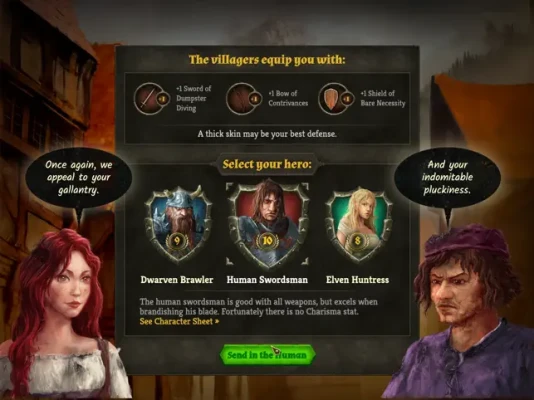 Use the best hero for the job, swapping mid-quest as needed. The Human Swordsman is a well-rounded fighter who excels with his blade. The Elven Huntress, with her archery and leaping ability, does best when keeping her distance. The Dwarven Brawler, relying on his trusty shield and deadly fist, enjoys charging into a crowd. With experience, each hero will gain new skills and improved feats.