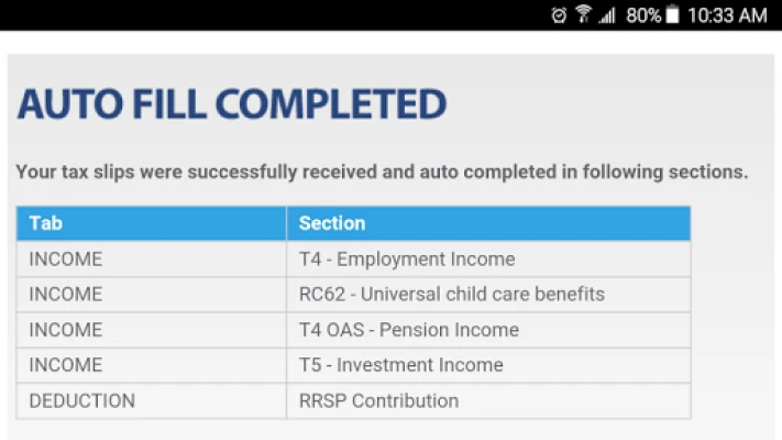 Canadian tax return filing got easier and faster with CRA Auto-fill My Return – Connect to CRA My account service through the fastneasytax app, download your available tax information for the current year and update your tax slip info in all the right places with just one click.
