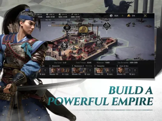 Recruit from over 100 different legendary Heroes to help you command your troops and manage your city! Get famous names in history, such as Julius Caesar, Alexander the Great, and Joan of Arc to help you establish your indomitable empire!