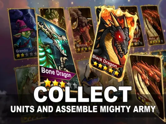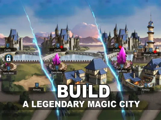 Recruit various heroes from might and magic. Collect, train and upgrade over 50 mighty creatures: Knights, Dragons, Beholder, Griffin, Medusa, Wizard and many more.