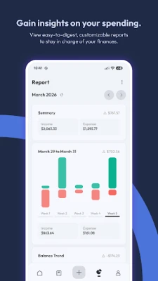 • Visualize and analyze your spending habits and earnings with detailed and flexible financial reports.
