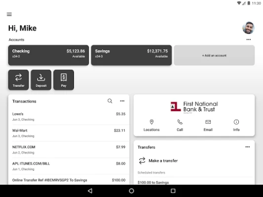 Contact: Locate ATMs or branches and contact First National Bank & Trust customer service directly from the app.