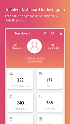 ★ Don’t Follow Me Back - People who don't follow you back on Instagram. ★ Mutual - Mutual followers, people you follow and they follow you back. ★ Follow Back - People you are not following on instagram. ★ I follow - All people you are following on instagram ★ Recent Unfollowers - People who unfollowed you recently. ★ Starred - Long press on any person from the list of people you follow to add them to your favourite list ★ Mass unfollow - Unfollow people with a single action.