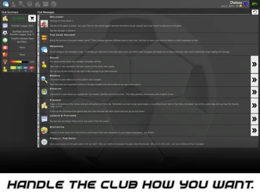 Make life easy and select an established club with superior finances, huge fan base, excellent facilities and a squad of talented players or really challenge yourself and select a lower league club with limited funds, facilities and squad depth! Can you develop a small local team into one of the world’s biggest clubs?