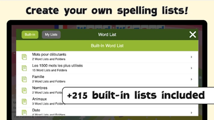3 spelling activities of increasing difficulty are provided to adapt the activity to the child’s spelling level. You can use the built-in word lists, or create your own.