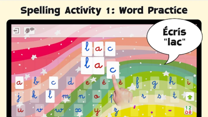 • A talking Movable Alphabet that allows kids to experiment with phonics and learn french word building thanks to the advanced text to speech engine.