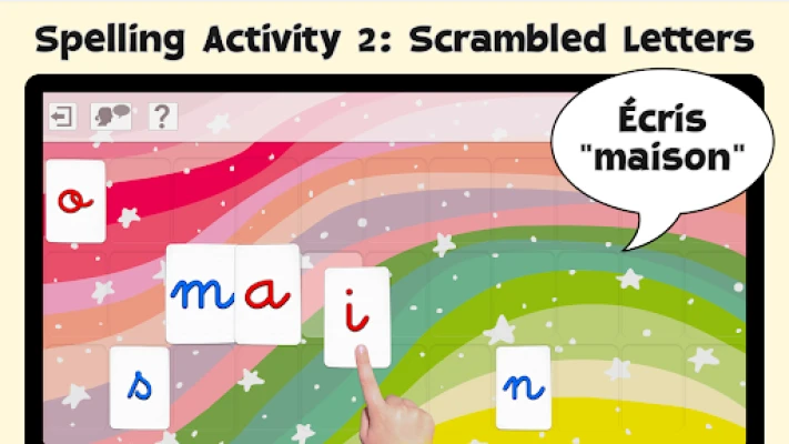 2 - "Scrambled Letters" says the word and displays the letters needed to build the word or sentence, and asks the child to reorder the letters.