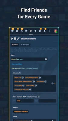 • Stop playing alone or with random people. Find Gamers on-demand and with the desired traits. Search and filter for gaming partners in 160,000+ Games using powerful Search Tools.