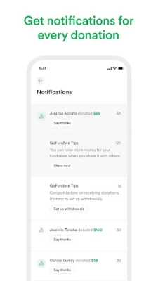 • Receive updates in real time: Never miss a donation or an important update about your fundraiser with timely app notifications