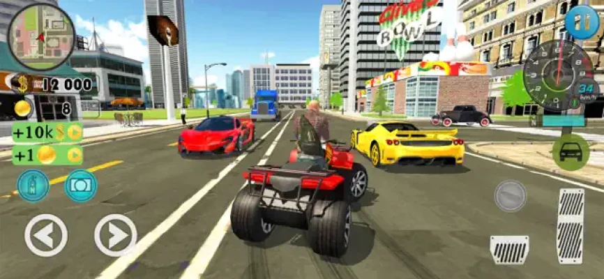 - Easy control - Fantastic graphics - Specific cars - Monster truck - Motorcycle riding - Quadrocycle riding - Motorboat riding - Buying a car - Auto salon - Wild island - Animals - Predators - Control of the third person - Grand Street - Grand City - Beautiful town - Fantastic car physics - Fantastic people physics - Football field