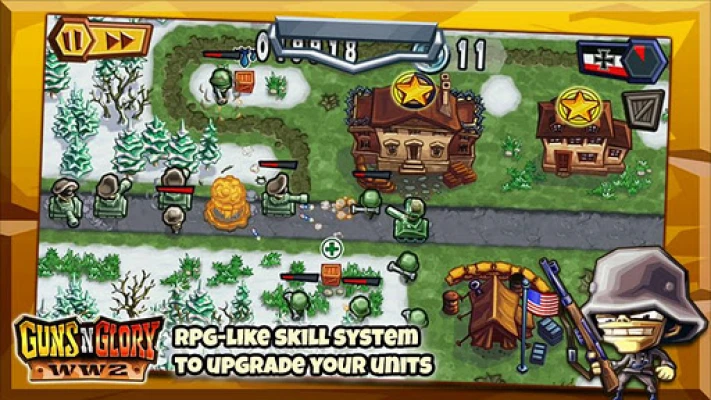 It’s the winter of 1944, Western Front. You and your boys are on guard duty when the enemy decides to throw wave after wave of troops at your position. Time to man the defenses! Recruit and upgrade troops, order tanks into battle and beat the enemy with superior tactics and firepower! Call in air strikes to gain the upper hand and collect supply crates to boost troop morale! Put the heat on the enemy with your flamethrowers and have your medics tend to your soldiers! Take up the guns and earn your glory!