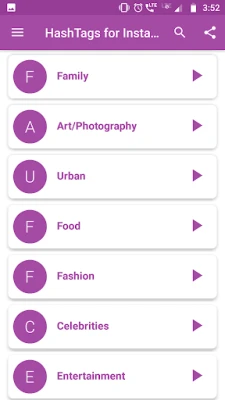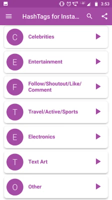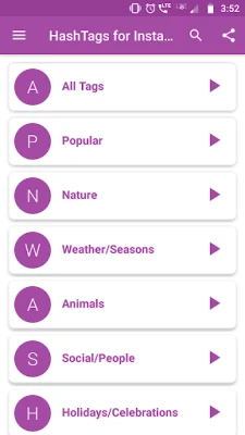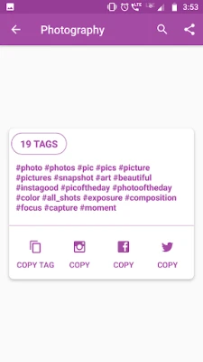 Simply choose a hashtag name, tap "Copy" button or tap "Copy with Facebook, Instagram, Twitter" button(means copy and open that app) then open Instagram, Facebook or Twitter and paste on your pictures and posts!