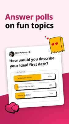 It’s a poll-based dating app designed to help you make friends who think like you. Answer a variety of polls on fun topics, show off your rizz and let the app's AI match you with your like-minded fam who shares the same thoughts and opinions as you. Hunch gives you a match score based on your answers to polls, helping you find people who really get you because you both think like each other. Be your authentic self, answer polls honestly, and chat with strangers. Hunch helps you easily talk to strangers and chat online with people who like the same things you do.