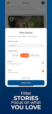 - Customize your experience by filtering matches by gender or initiating chats through stories using coins.