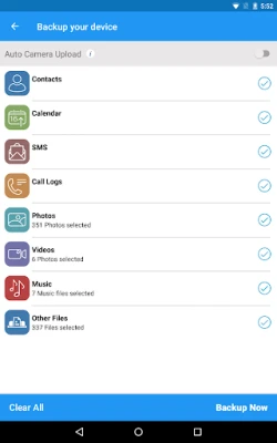 · Backup and Restore contacts, photos, videos, SD card files, call logs, calendar, and text messages with a single tap.