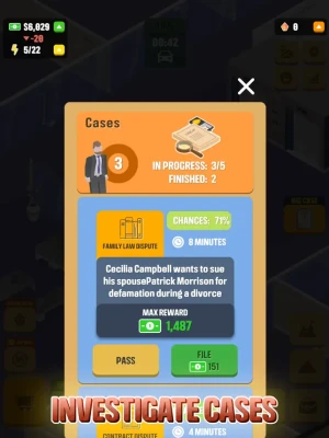 Run the office and manage your lawyers. Provide legal advice for the clients and earn money to become a business tycoon. Lawyers visit the courthouse daily, so make sure to keep them satisfied and motivated to win most cases.