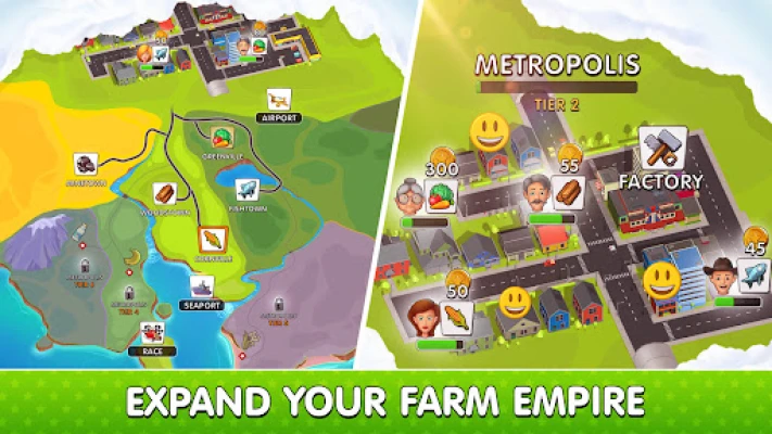 Build up, upgrade and expand your millionaire farming empire in this capitalist tap clicker game. Improve your productivity by automating your specialized farms by investing in your new managers and level up their earnings.
